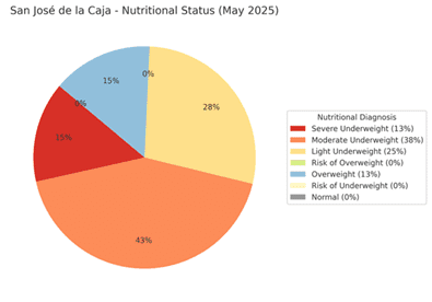In May, the program welcomed its newest community, San José de la Caja, with 7 families and 8 children receiving nutritional support. Initial assessments revealed serious concerns, ranging from severe underweight to early signs of obesity, highlighting the urgent need for intervention.
